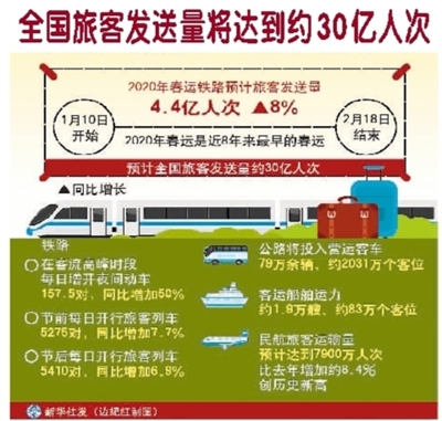 从1月10日至2月18日,40天春运期间,全国旅客发送量将达到约30亿人次,与上年大致持平、略有增长。