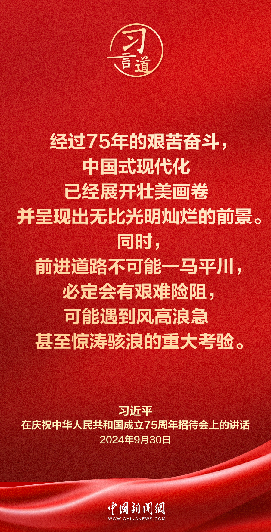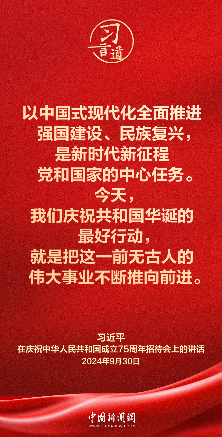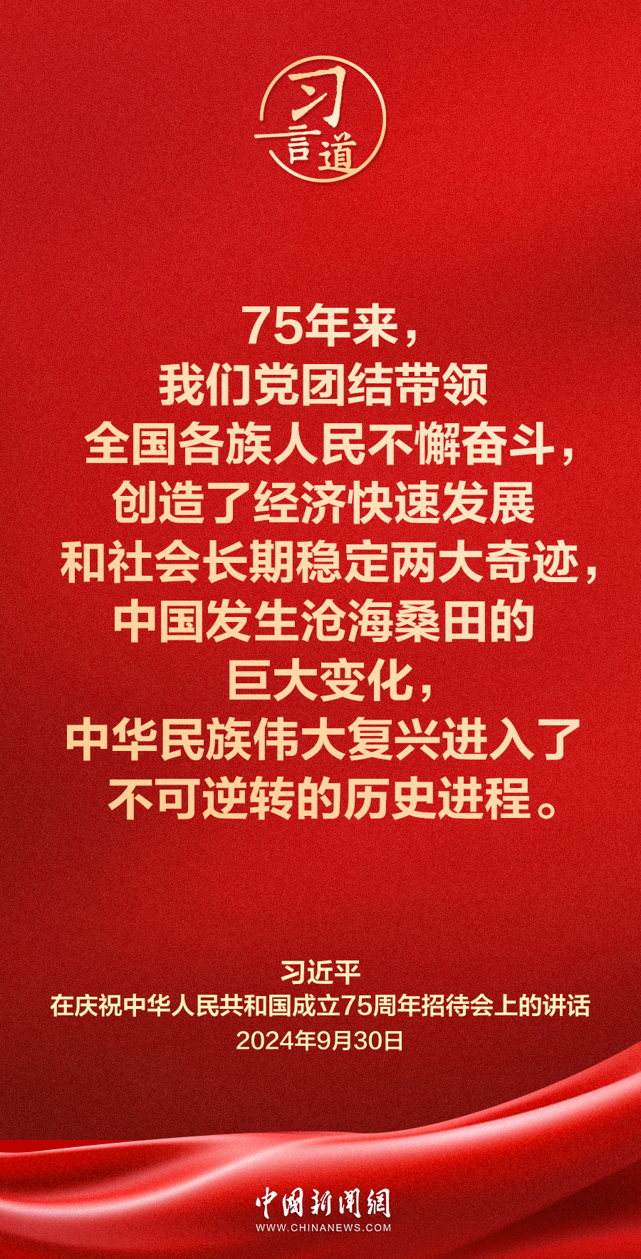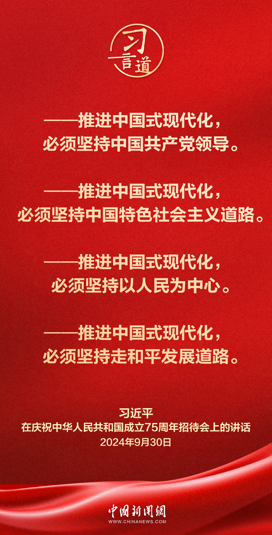庆祝中华人民共和国成立75周年招待会30日在人民大会堂隆重举行。中共中央总书记、国家主席、中央军委主席习近平出席招待会并发表重要讲话。他强调——