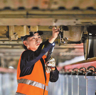 1月7日,南昌西动车所动车机械师在列车底部检修作业。 本报记者 朱 磊摄
