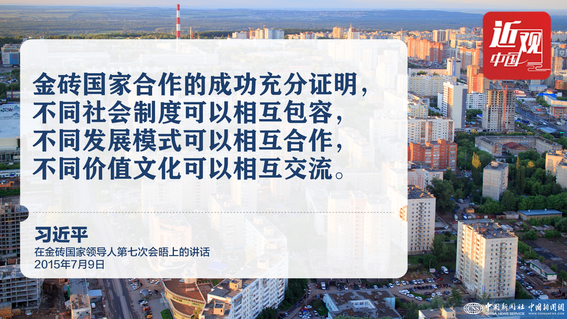 当地时间2015年7月9日,金砖国家领导人第七次会晤在俄罗斯乌法举行。中国国家主席习近平发表了题为《共建伙伴关系 共创美好未来》的主旨讲话。