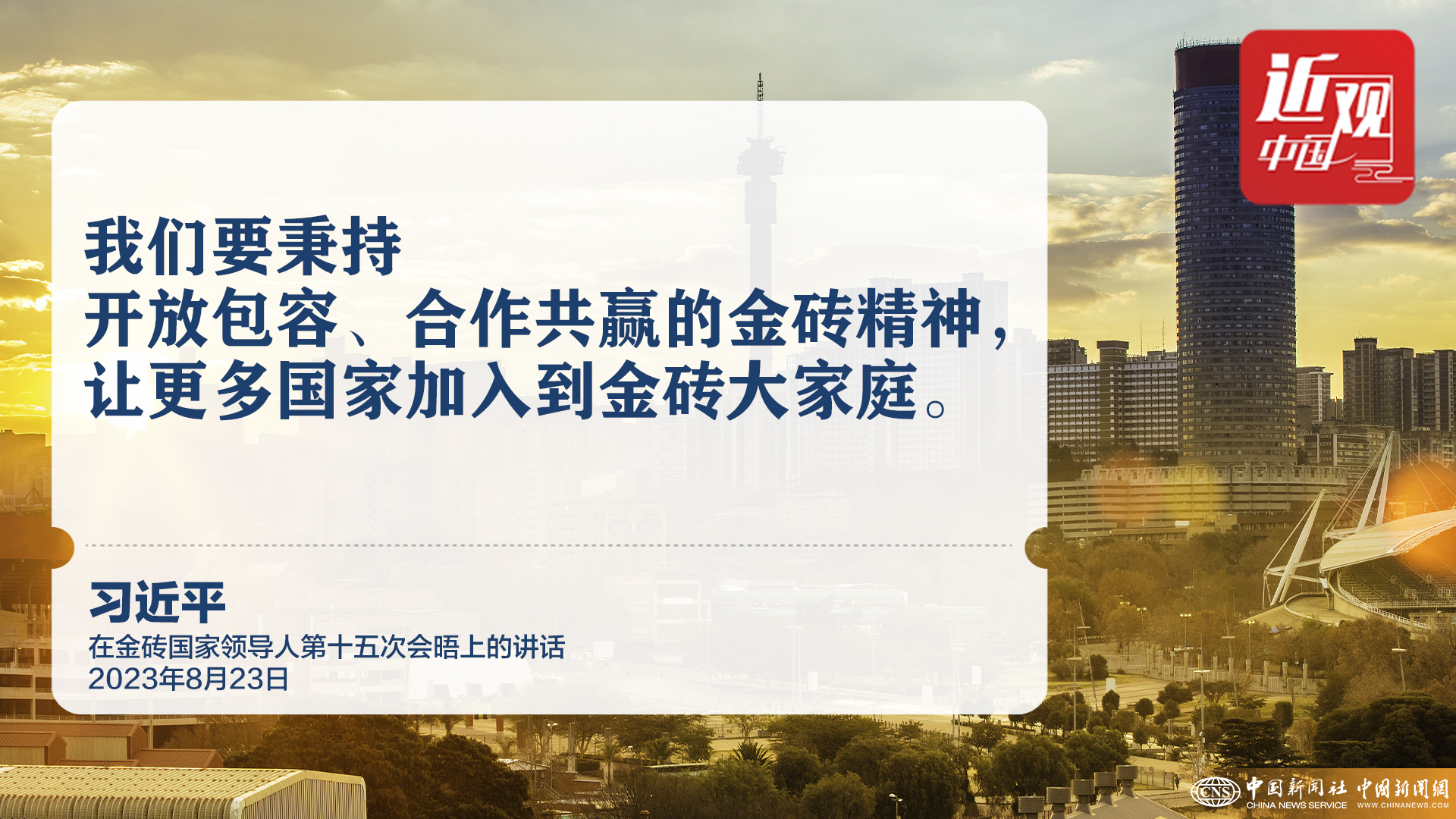 习近平强调,我们要秉持开放包容、合作共赢的金砖精神,让更多国家加入到金砖大家庭,集众智、汇群力,推动全球治理朝着更加公正合理的方向发展。