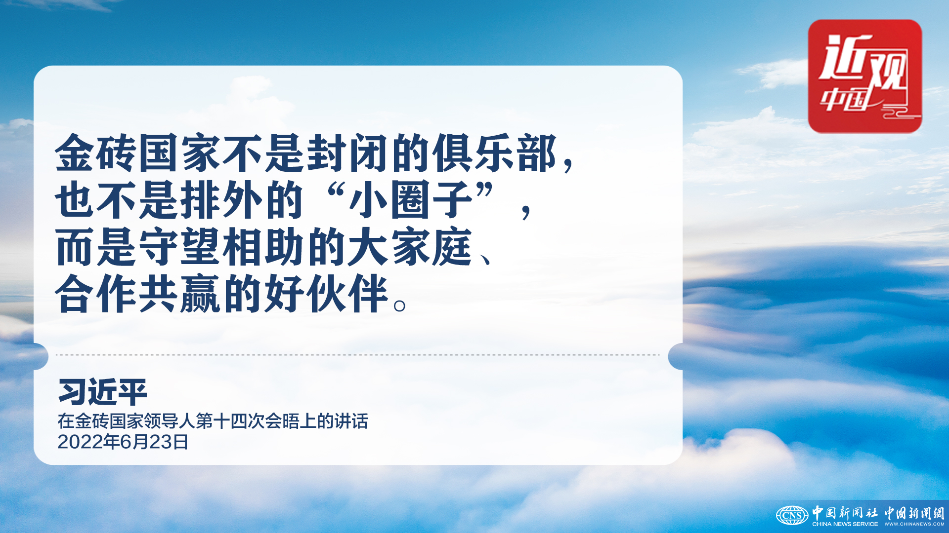 2022年6月23日晚,中国国家主席习近平在北京以视频方式主持金砖国家领导人第十四次会晤。习近平发表题为《构建高质量伙伴关系 开启金砖合作新征程》的重要讲话。
