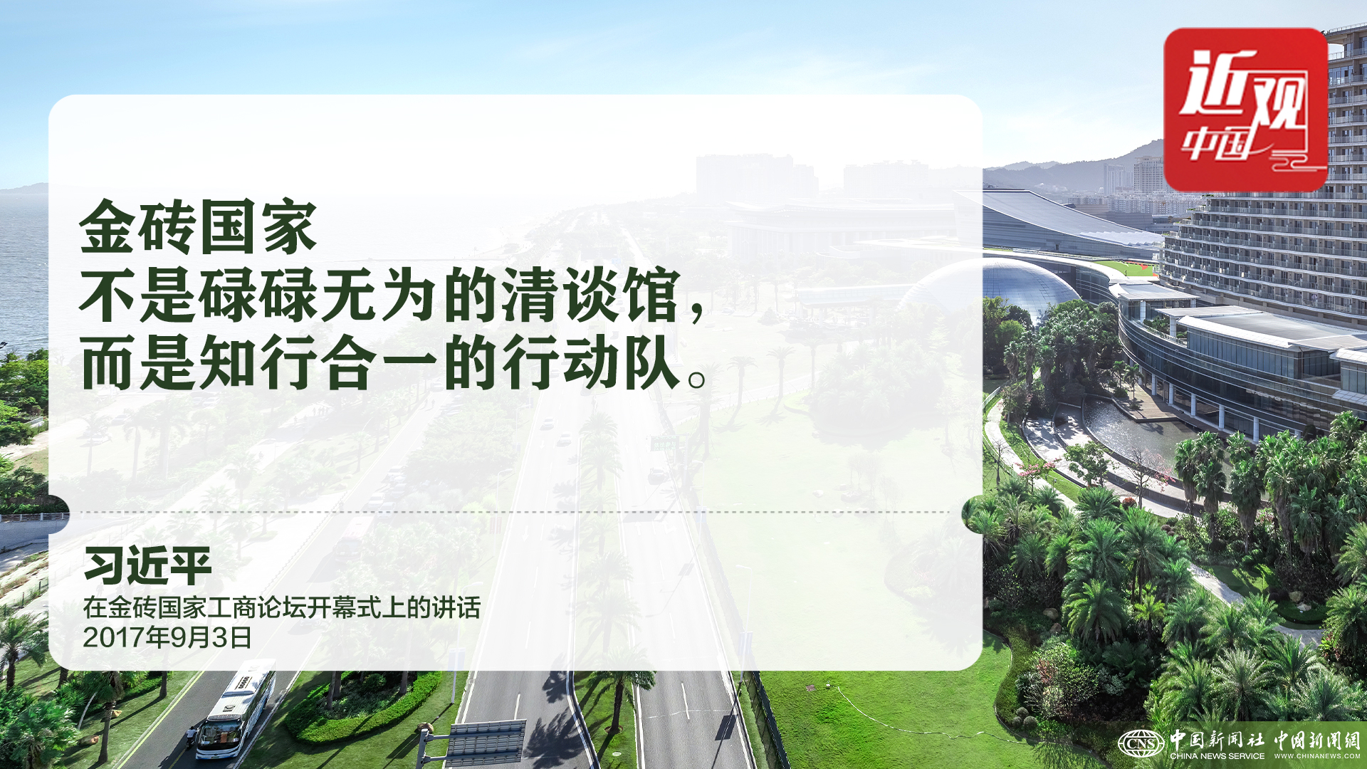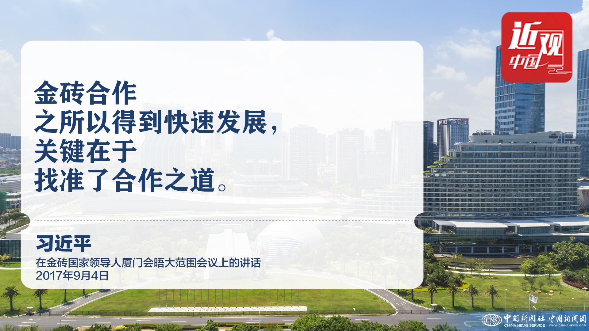 2017年9月4日,金砖国家领导人第九次会晤在厦门国际会议中心举行。在大范围会议上,中国国家主席习近平发表题为《深化金砖伙伴关系 开辟更加光明未来》的重要讲话。