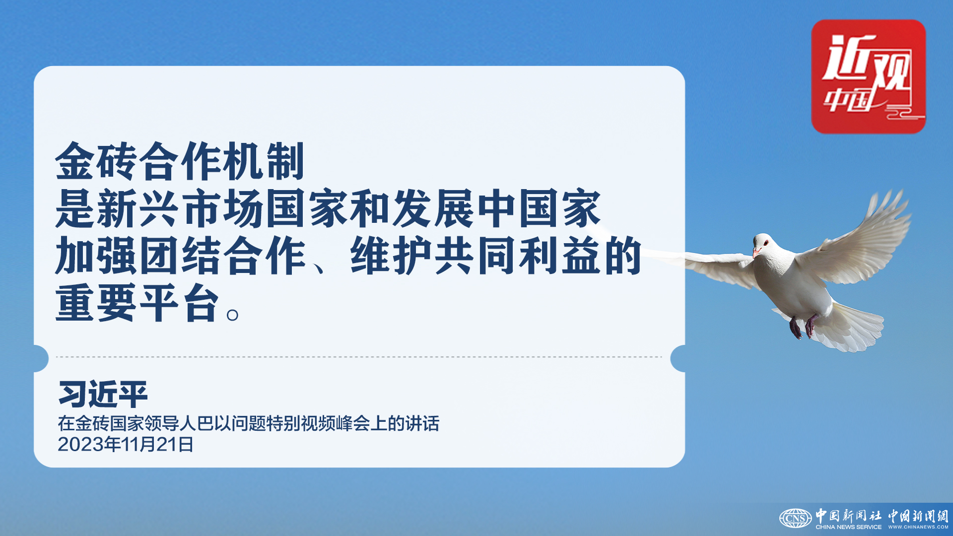2023年11月21日晚,中国国家主席习近平出席金砖国家领导人巴以问题特别视频峰会并发表题为《推动停火止战 实现持久和平安全》的重要讲话。