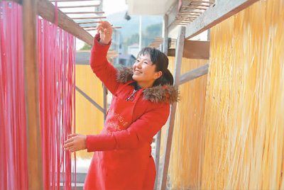 湖南省湘西土家族苗族自治州龙山县发展农产品加工,助力群众脱贫致富。图为龙山县茅坪乡干坝村村民在用蔬菜、瓜果等原料,加工五彩面条,供应春节市场。 曾祥辉摄(人民视觉)
