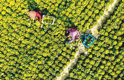 2019年12月31日,安徽省合肥市庐江县郭河镇丰美农业示范园里,员工们正在大棚里采收白菜、黄心乌等当地绿色种植特色农产品蔬菜。 左学长摄(人民视觉)