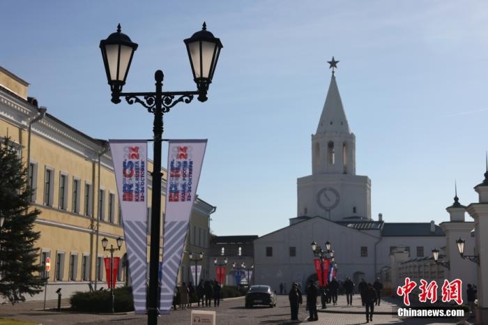 当地时间10月20日,俄罗斯喀山大街上悬挂着金砖峰会条幅。金砖国家领导人第十六次会晤于2024年10月22日至24日在俄罗斯喀山举行。