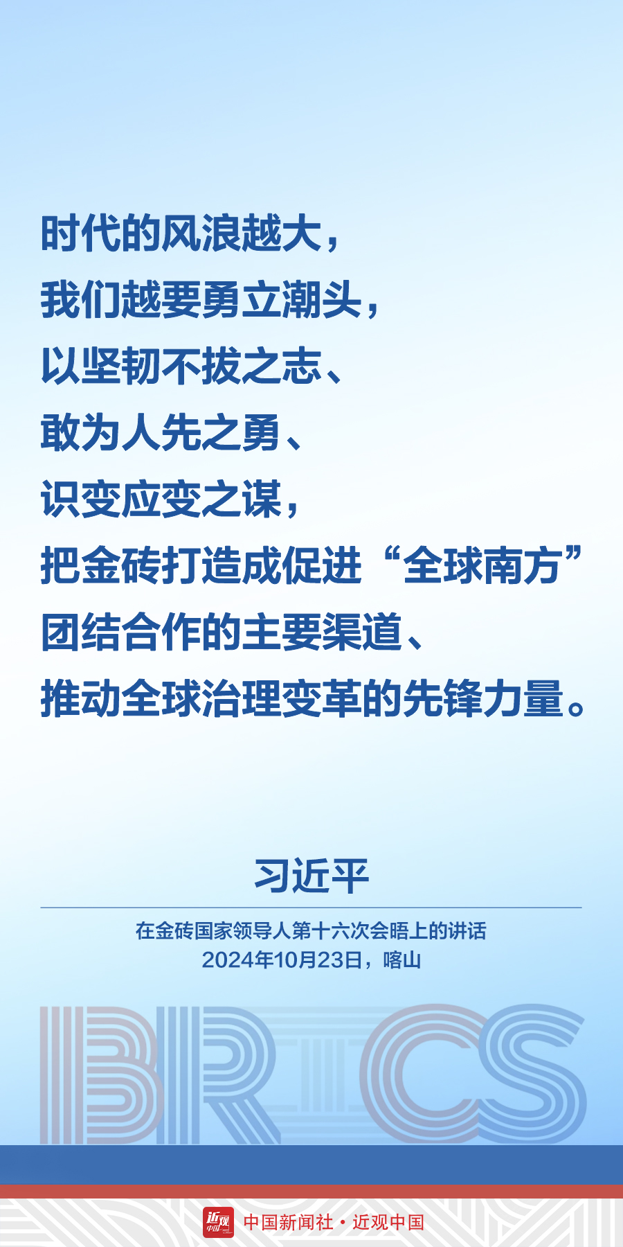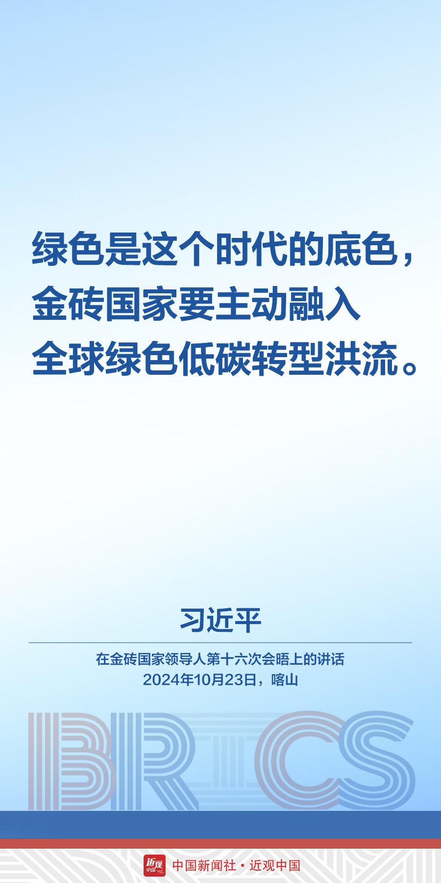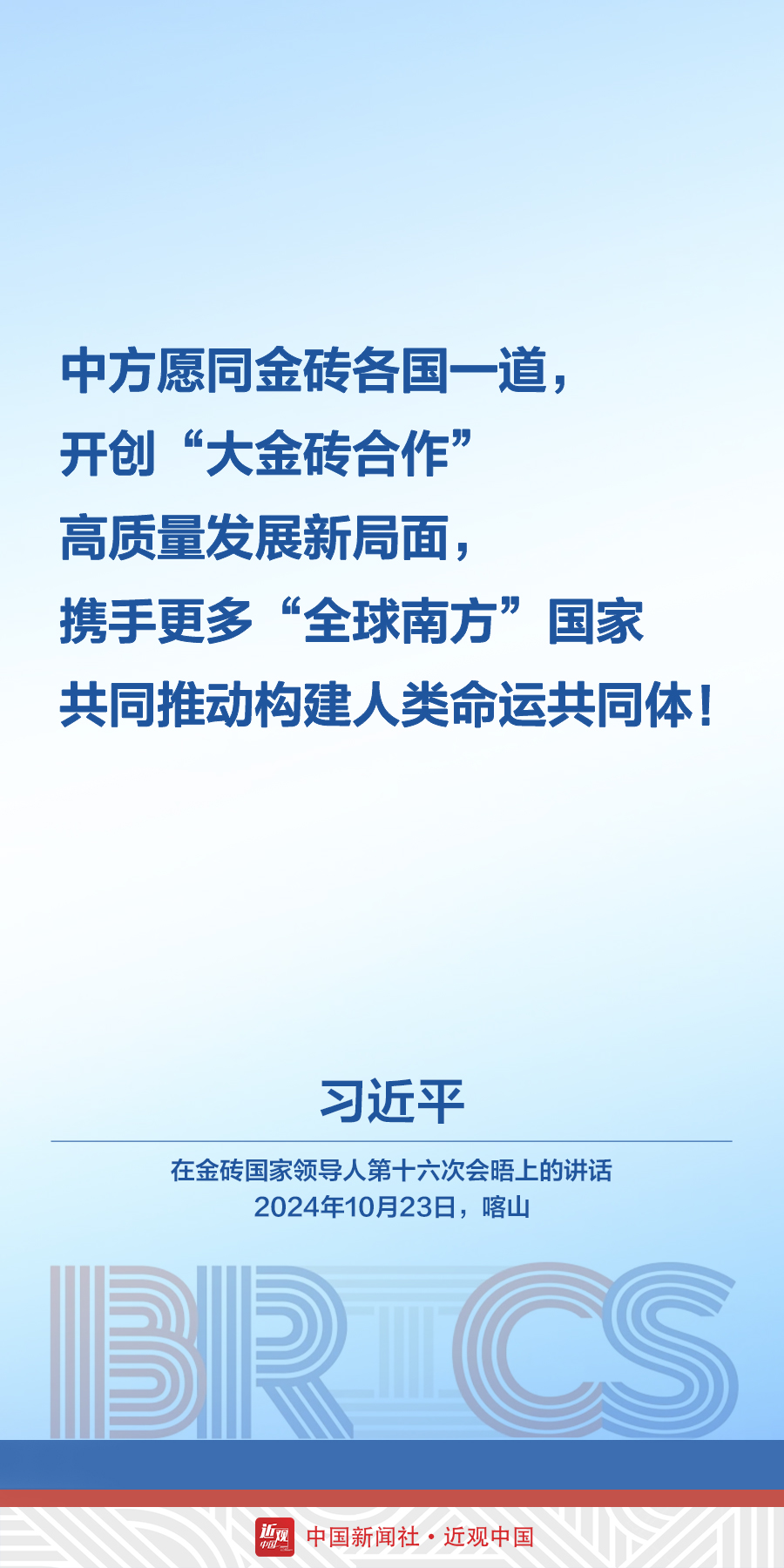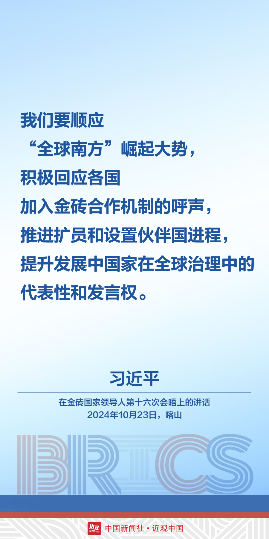 当地时间10月23日,中国国家主席习近平在俄罗斯喀山出席金砖国家领导人第十六次会晤。他在讲话中发出中国声音——