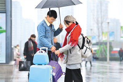 1月15日,一对情侣在宁波火车站南广场。胡学军摄(人民图片)