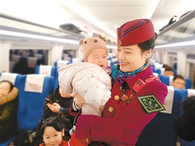 1月15日,在厦门北至成都东G2372次动车组上,“列车妈妈”周弋乔怀抱返乡的“小候鸟”。胡志强摄(人民图片)