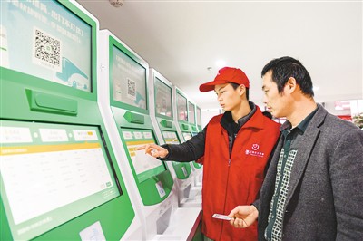 1月15日,重庆市綦江区二级车站,共青团重庆市綦江区委青年志愿者帮旅客购票。陈星宇摄(人民图片)