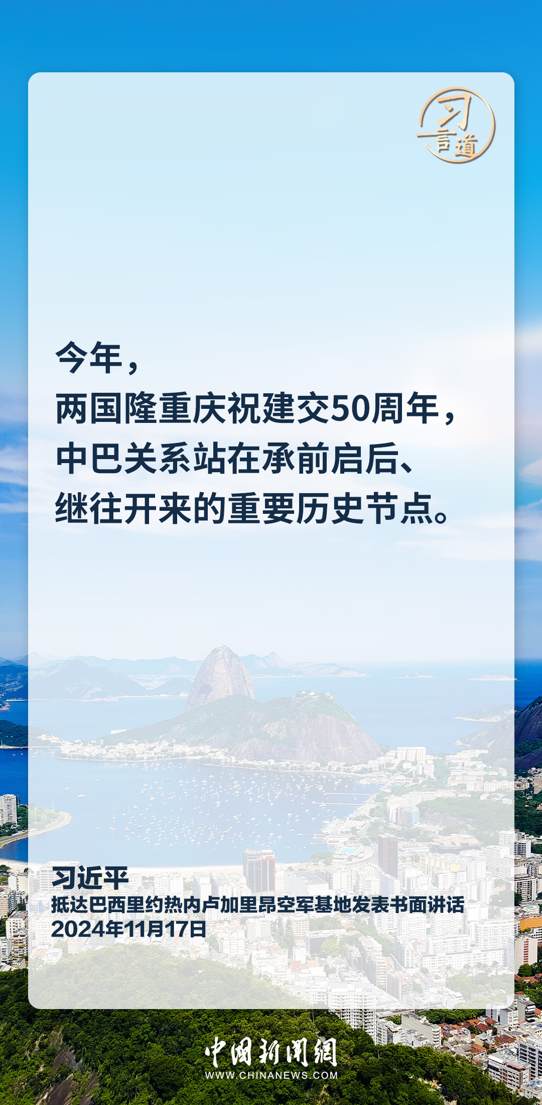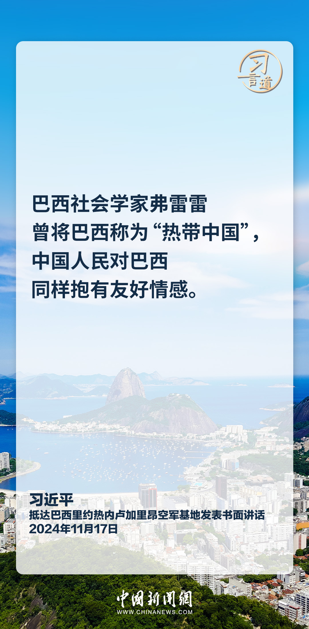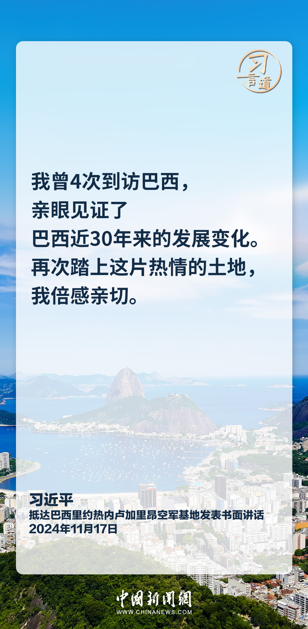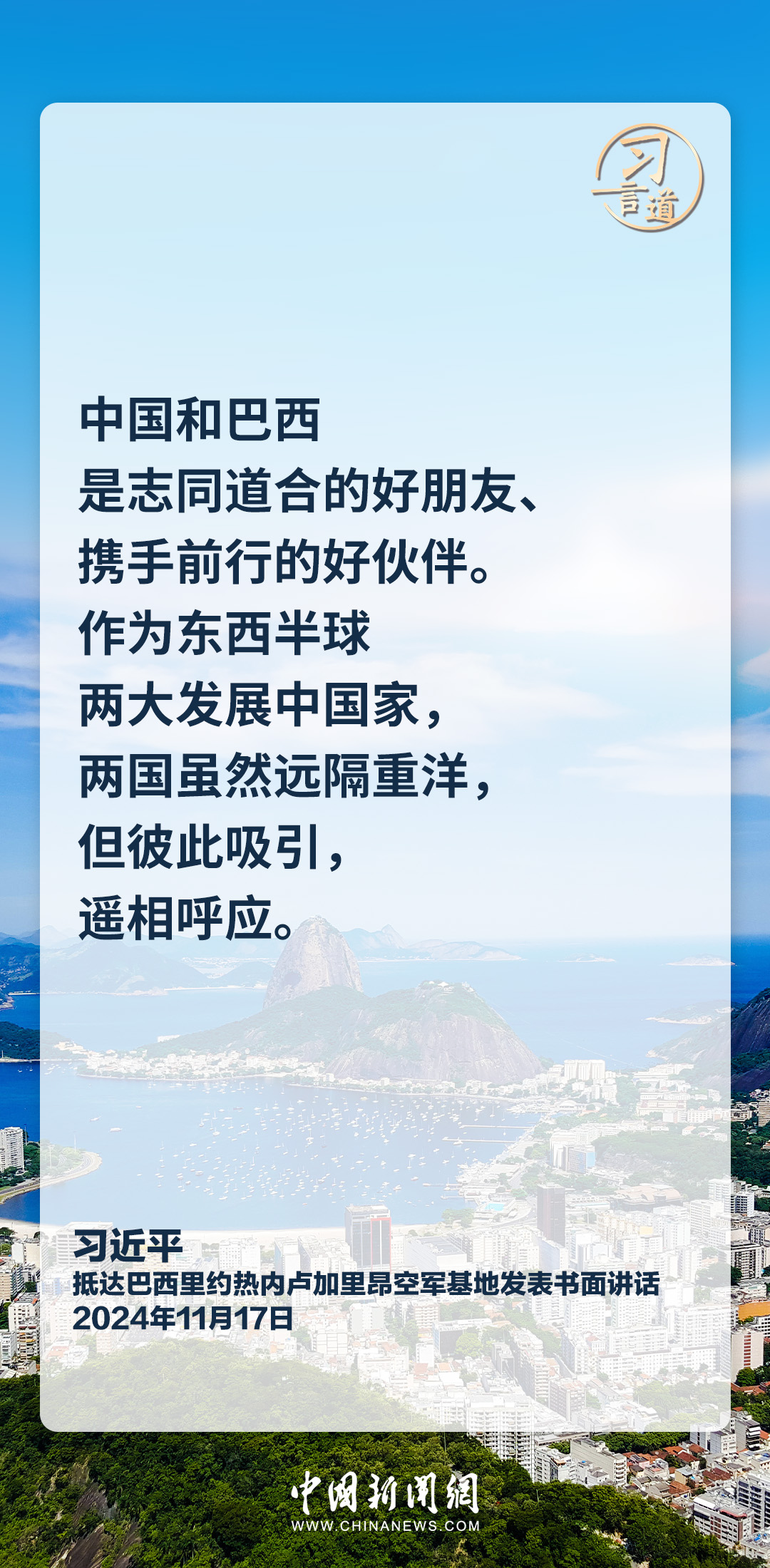 当地时间11月17日,中国国家主席习近平乘专机抵达里约热内卢,应巴西联邦共和国总统卢拉邀请,出席二十国集团领导人第十九次峰会并对巴西进行国事访问。习近平发表机场书面讲话,他指出——