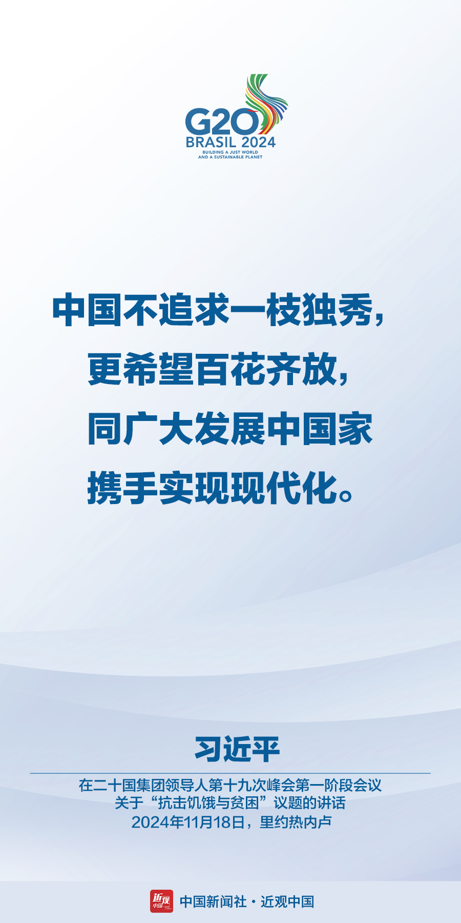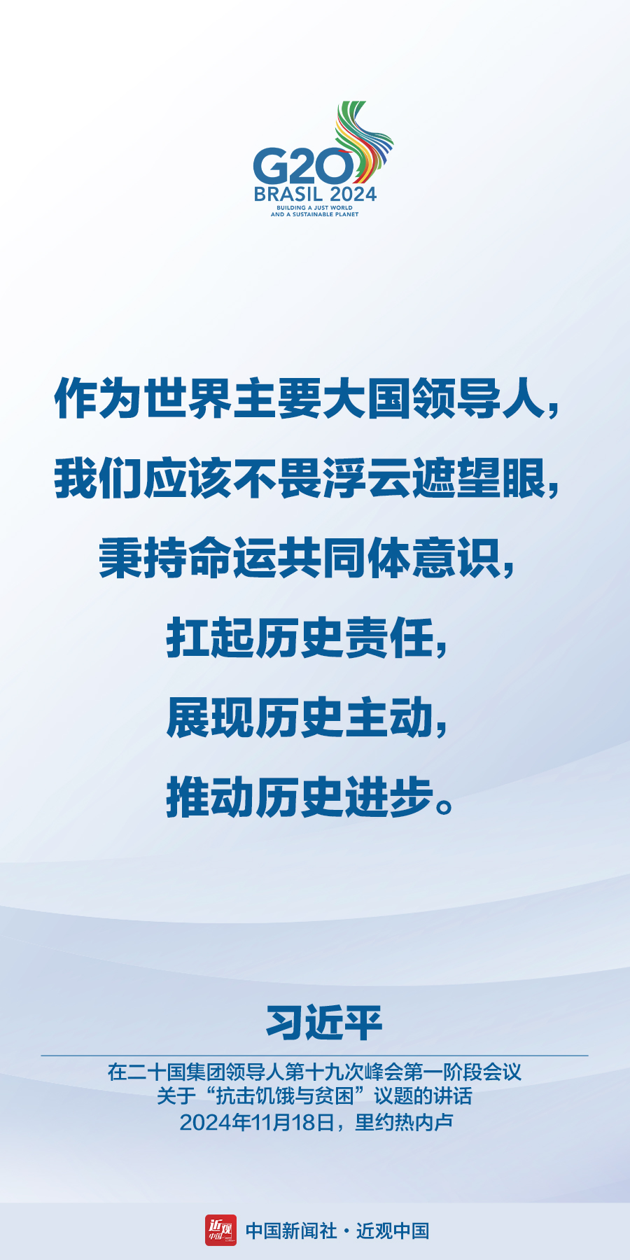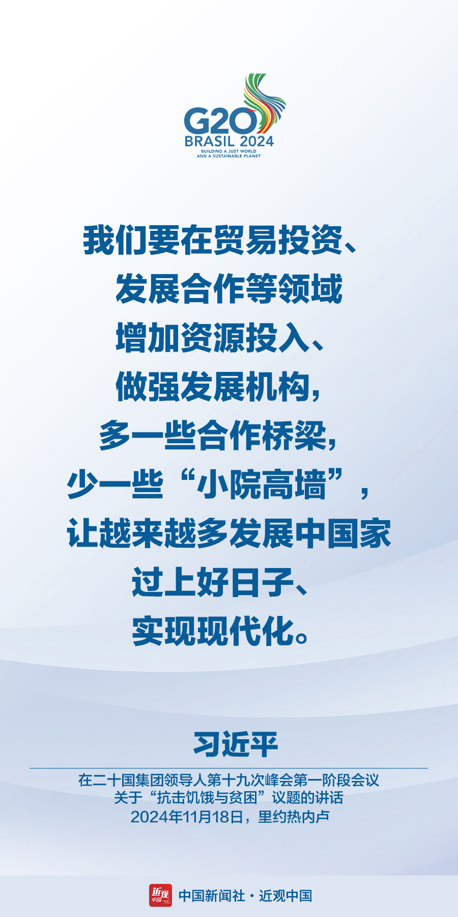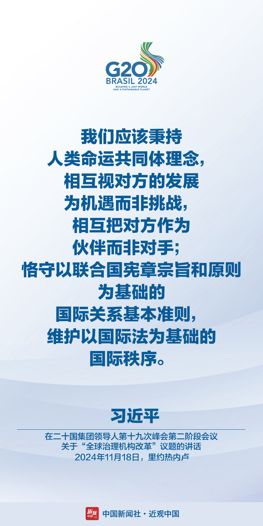 当地时间11月18日,国家主席习近平在巴西里约热内卢出席二十国集团领导人第十九次峰会。在峰会第一阶段围绕“抗击饥饿与贫困”议题讨论时,习近平发表题为《建设一个共同发展的公正世界》的重要讲话。在峰会第二阶段会议围绕“全球治理机构改革”议题讨论时,习近平发表题为《携手构建公正合理的全球治理体系》的重要讲话。习近平指出——