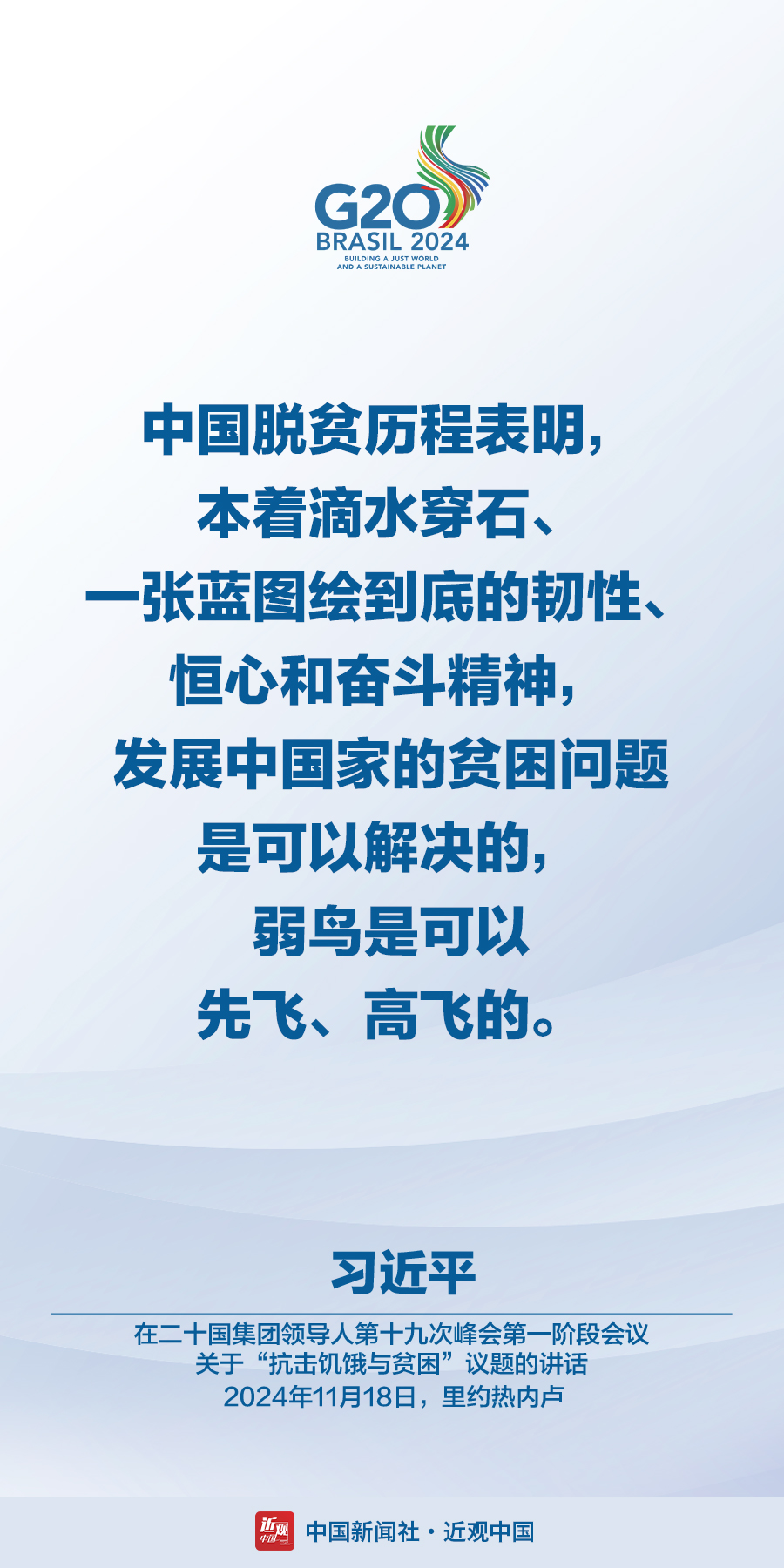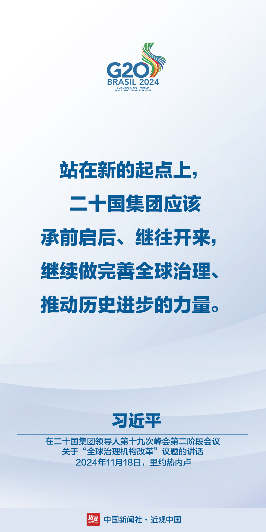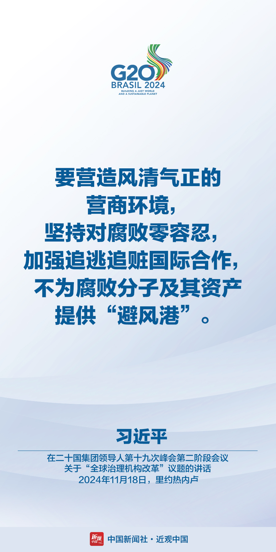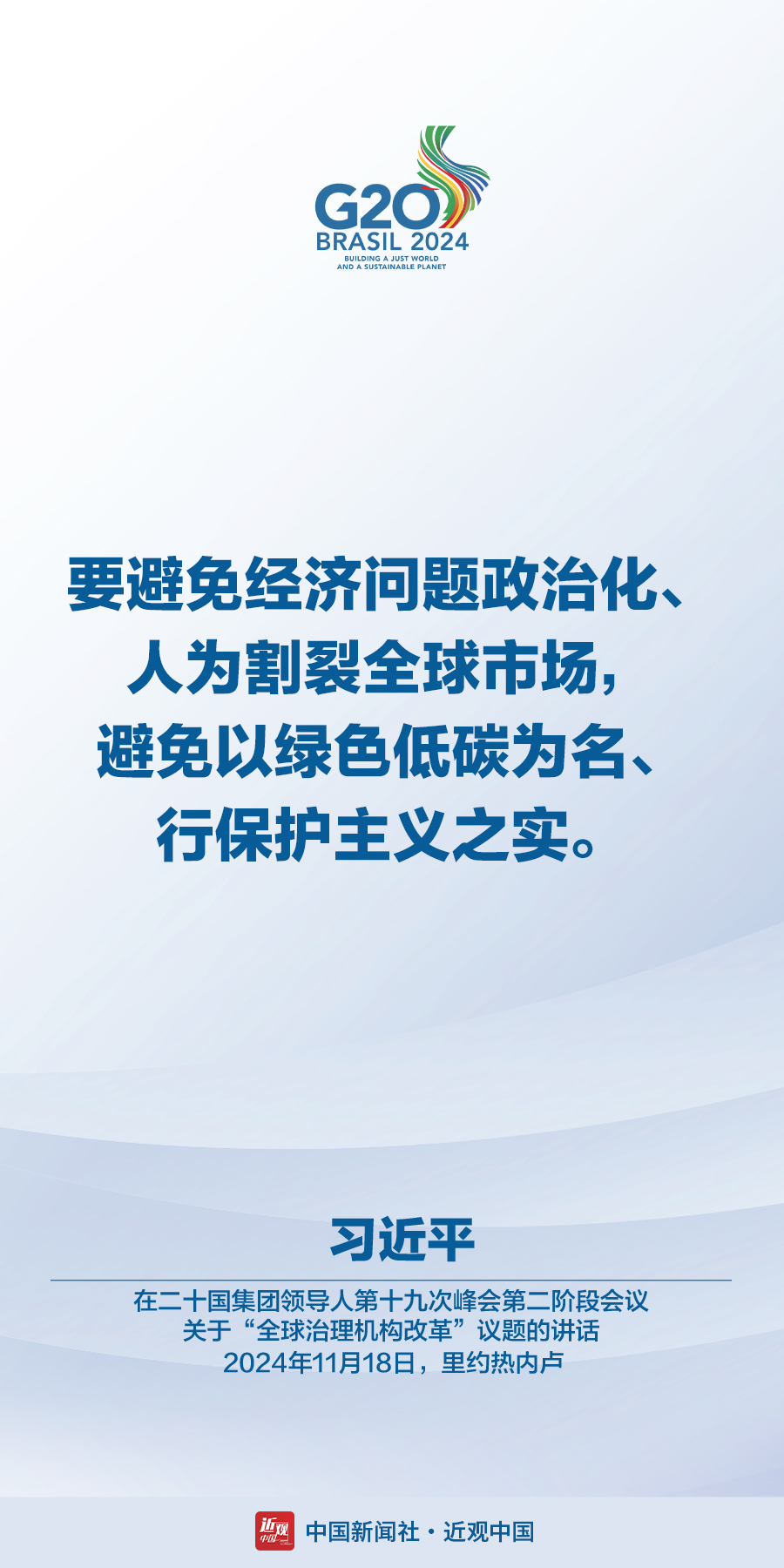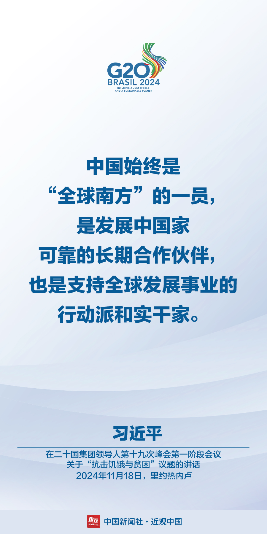 当地时间11月18日,国家主席习近平在巴西里约热内卢出席二十国集团领导人第十九次峰会。在峰会第一阶段围绕“抗击饥饿与贫困”议题讨论时,习近平发表题为《建设一个共同发展的公正世界》的重要讲话。在峰会第二阶段会议围绕“全球治理机构改革”议题讨论时,习近平发表题为《携手构建公正合理的全球治理体系》的重要讲话。习近平指出——