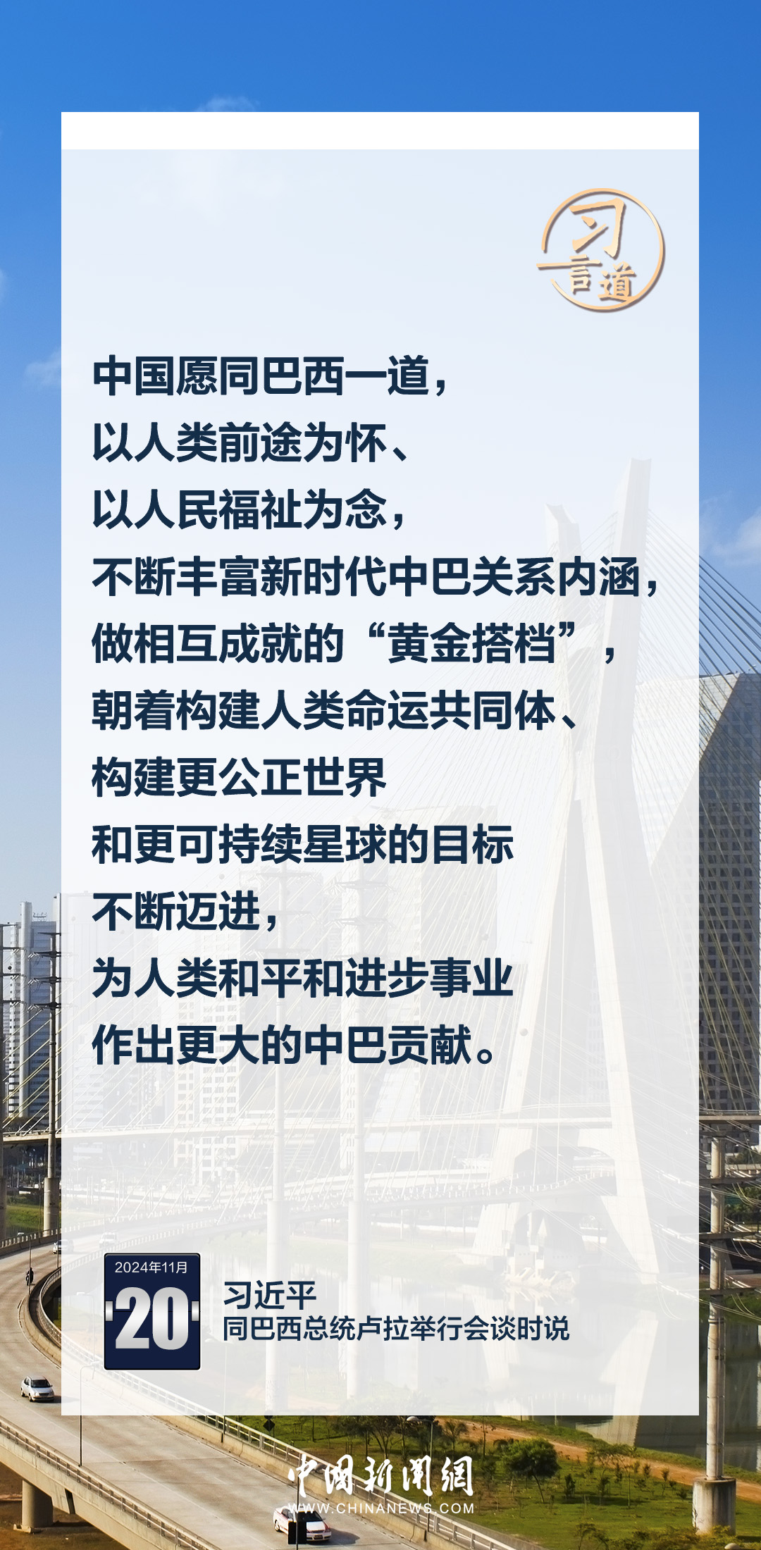 当地时间11月20日,中国国家主席习近平在巴西利亚总统官邸同巴西总统卢拉举行会谈。习近平指出——