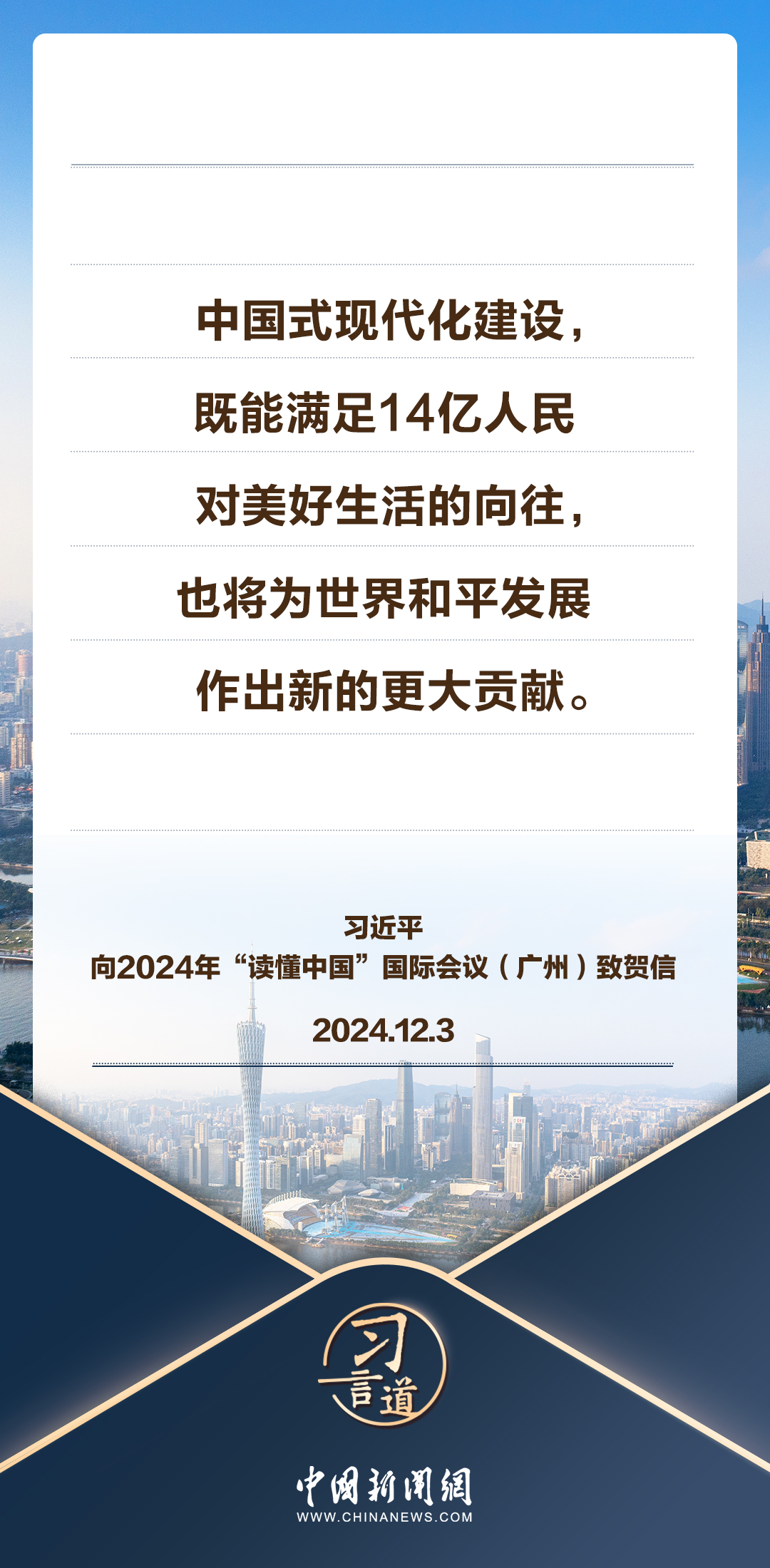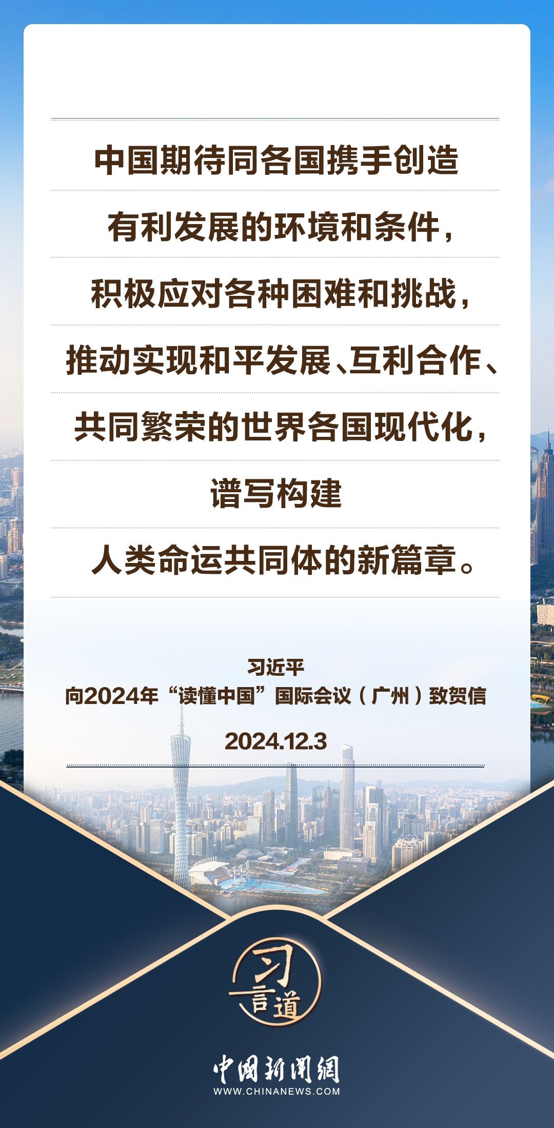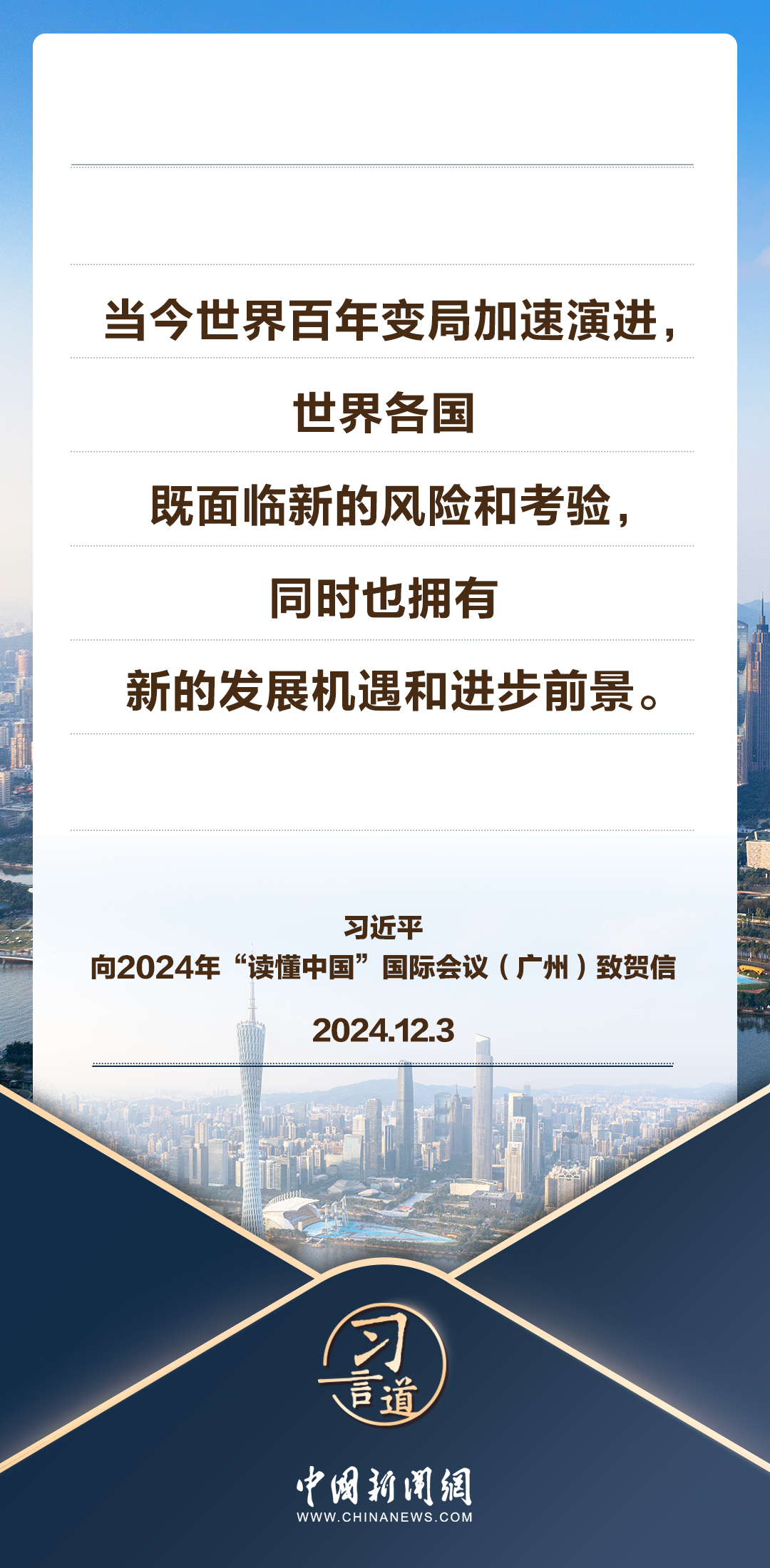 12月3日,国家主席习近平向2024年“读懂中国”国际会议(广州)致贺信。习近平指出——