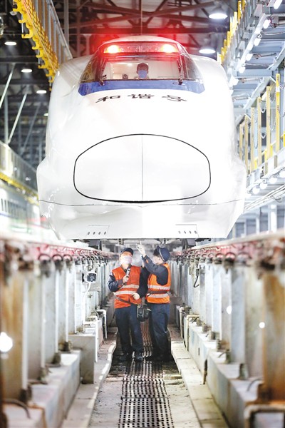 2月1日凌晨,南昌车辆段南昌西动车所动车组机械师正在检修动车组车头底部部件。 丁 波摄(人民视觉)