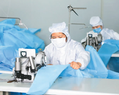 工人们在加班加点地生产防护服。 李发兴摄