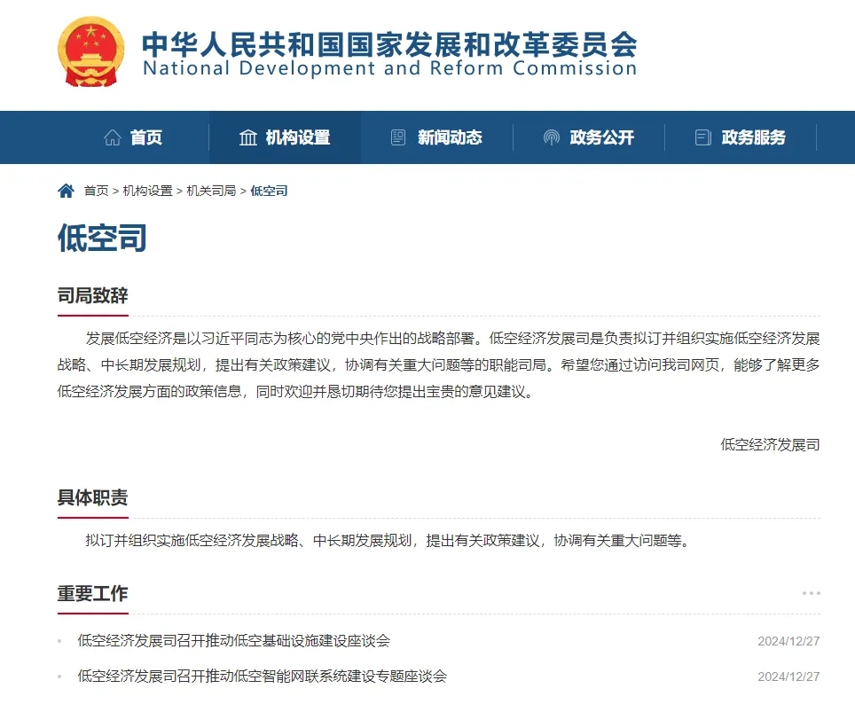 网站信息显示,国家发改委低空经济发展司是负责拟订并组织实施低空经济发展战略、中长期发展规划,提出有关政策建议,协调有关重大问题等的职能司局。