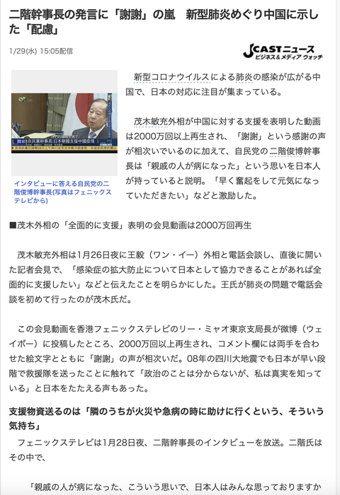 日本執政黨自民黨幹事長二階俊博,在東京接受了鳳凰衛視的獨家專訪。他代表日本政府向中國的肺炎疫情表示慰問,「中國的疫情,對日本來說,就如同親戚、友人生病,兩國有情誼,日本當然要立即伸出援手」。同時,他表示日本要以舉國之力,全力支持中國。