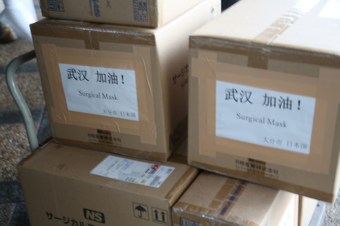武漢市的友好城市大分市,捐贈3萬個口罩,寫下「武漢加油」;