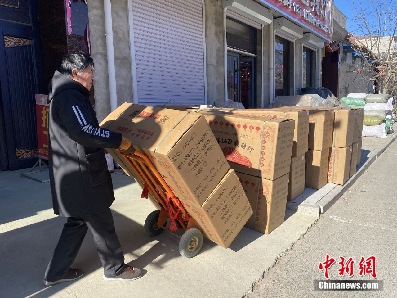 工人正在运送打包好的灯笼制品,以备装车发往全国各地。 李玉素 摄