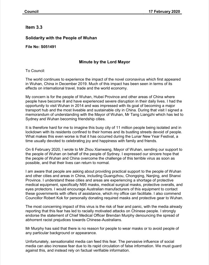 在此,我谨代表悉尼致以我们最真诚的关切和问候。我们由衷希望武汉和中国能尽快度过难关,期待人民生活尽快回归正常。