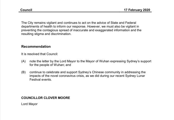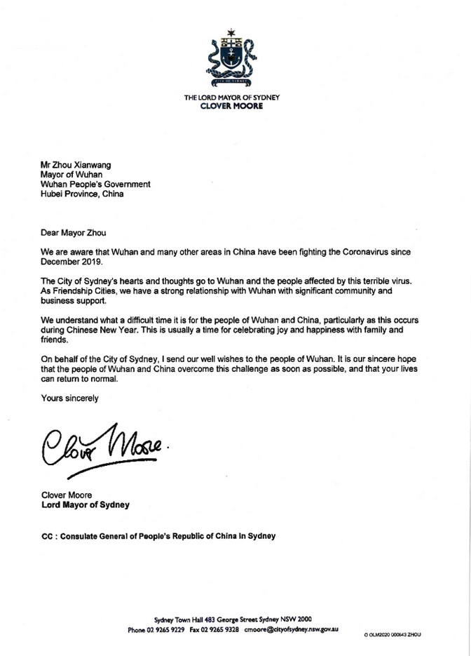 随附悉尼市长克劳馥 摩尔(Clover Moore )2月17日所书信函原件。信函内容可谓情真意切,充分表达了作为武汉友好城市的悉尼,其市政府及人民,对武汉、湖北及全中国早日战胜疫情,恢复正常秩序的期盼,从中折射出澳中友好关系的牢不可破;从另一方面,也反映出广大的居澳华人华侨对澳大利亚贡献的被认可度及其对积极促进澳中关系友好发展的重要作用。(ACTV编者注)