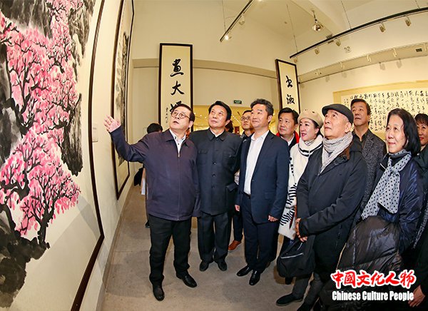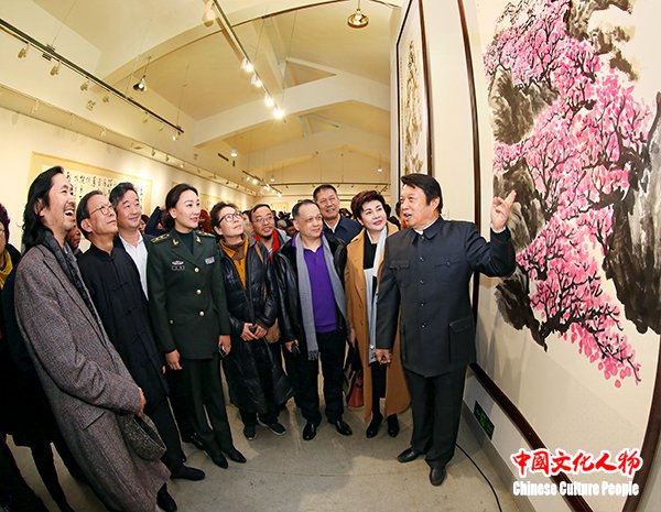 覃志刚向毛新宇夫人刘滨,中国艺术研究院艺术创作院艺委会主任吴悦石,著名画家孟祥顺等参观展览的艺术家和嘉宾介绍展览作品《春风杨柳图》的主题思想和创作过程