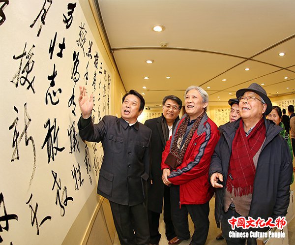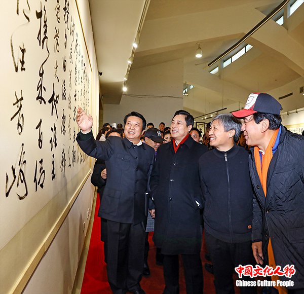 覃志刚向原文化部副部长、中国文联副主席董伟,中国书法家协会分党组书记、副主席陈洪武,表演艺术家朱时茂等参观展览的领导和艺术家嘉宾介绍展览作品《沁园春·长沙》