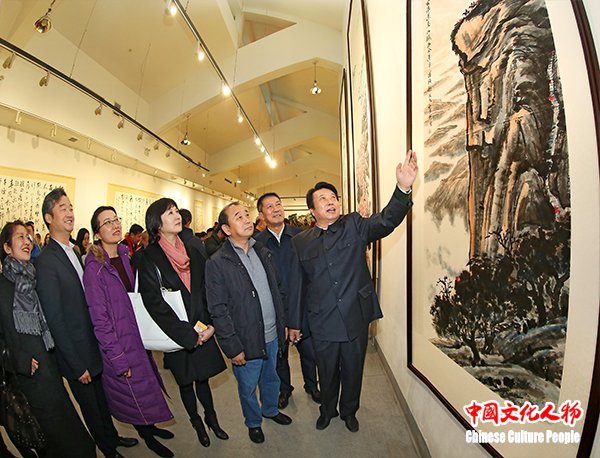 中国美协原副秘书长、中国书协原副秘书长张旭光,中国楹联学会副会长李培隽等参观展览的艺术家嘉宾在覃志刚展览作品前驻足交流