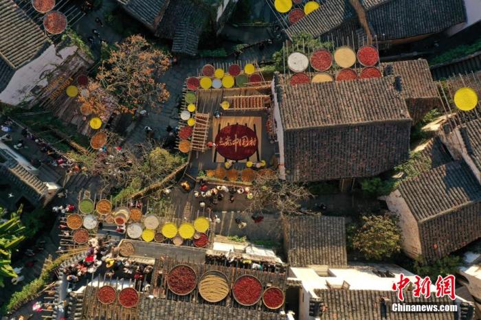 “中国最美乡村”江西婺源县篁岭古村独特的“晒秋”农俗景观,吸引八方游客参观。 中新社记者 刘占昆 摄
