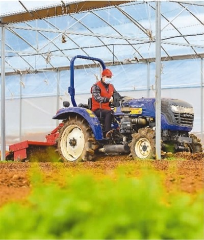 江西省赣州市会昌县富城乡寨头村村民蔡伟斌驾驶旋耕拖拉机,帮助合作社贫困户社员的蔬菜大棚土地进行松土作业。 朱海鹏摄(人民视觉)