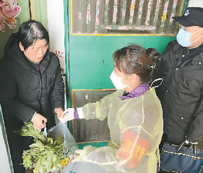 社区主任董守芝(中)上门为社区居民送菜。 受访者供图