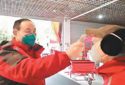 站长钱冉昊(左)在为站点快递员测体温。 网络图片