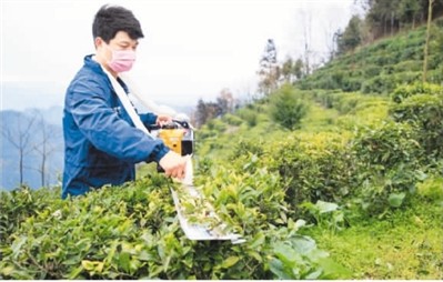 2月23日,天空放晴,茶农们戴着口罩,在海拔860米的马路镇岳溪村青云观茶园里,分布山头各个角落,栽种刚刚冒出绿芽的茶苗。