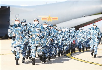 2月17日凌晨,空军出动运输机第四次向武汉空运676名军队支援湖北医疗队队员和一批医疗物资。图为刚下飞机的医疗队员列队跑步离开停机坪。 新华社记者