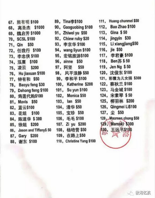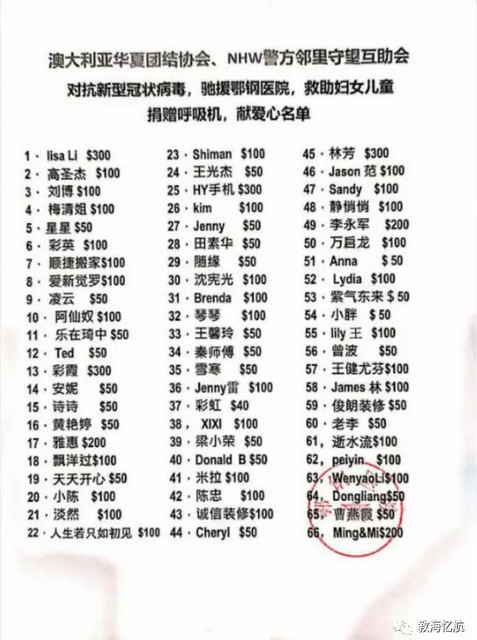 就在李会长忙碌的同一时间,澳大利亚华夏团结协会和澳大利亚警民守望互助会的成员们也在默默无声地进行捐款。凌云大姐每天不停地刷新名单,核对捐款人;高圣杰带头捐款,还不断鼓励大家捐献爱心;会员们不停地转发湖北的疫情动态,同胞们接龙式捐款者越来越多。由于140多个捐款人的名单中有许多人不愿意留名而用网名,以至核对名单颇费周折。30澳元、100澳元、500澳元、1000澳元……无论多少,无论先后;不分年龄,不分海内外,汇聚的是海外华侨华人一颗颗炽热的爱国心;他们牵挂的是中国、是湖北、是鄂州的同胞们,他们期望的是华夏子孙团结一致,早日打赢这一战疫!