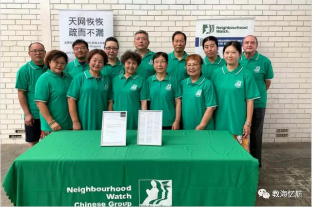 NHW(邻里守望组织)澳大利亚及新西兰全国主席Mr Bernie Durkin.西澳州警察总部多元文化负责人Mr Dominic Wood.NHW (邻里守望组织)华人主席Lisa 李女士和侨胞在一起