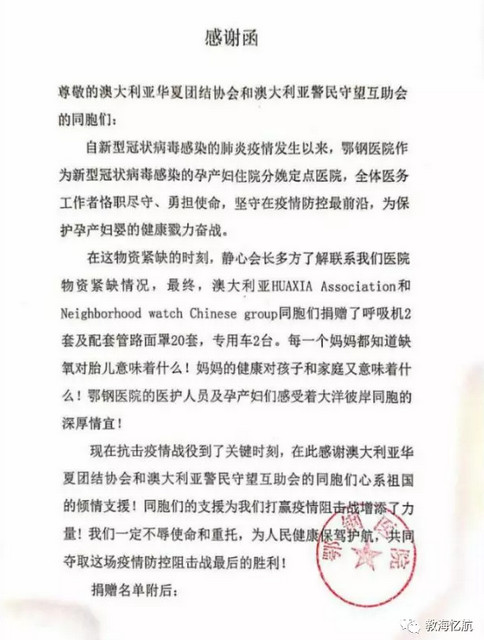鄂钢医院的医护人员和孕产妇们十分感谢澳大利亚华夏团结协会和澳大利亚警民守望互助会的同胞们!感谢同胞们的倾情相助!呼吸机太及时、太重要了!