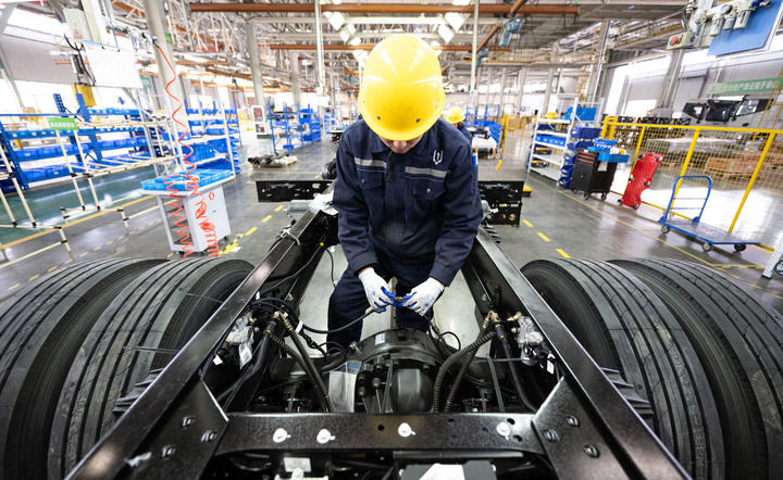 2月13日,工人在程力专用汽车股份有限公司新能源商用车底盘装配线上作业。新华社记者肖艺九摄