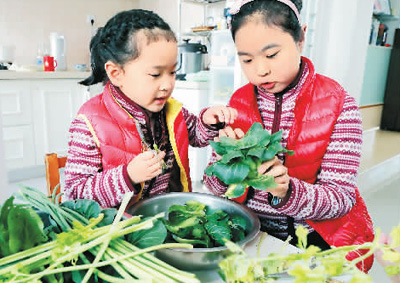 由于新冠肺炎疫情,小学生假期延长了。江苏省苏州市小学生们的宅家生活安排得丰富多彩,提高自己的生活自理能力和劳动技能。图为苏州工业园区星港学校五年1班小学生俞圣安正和妹妹俞隽安一起帮妈妈检菜。华雪根摄(人民图片)