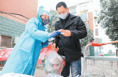 新冠肺炎疫情防控工作启动以来,河南省焦作市温县相关部门协调指导县域各大超市开通线上购物渠道,通过微信公众号、微信群、电话订购等方式获取订单,提供代购送货上门的便民服务。图为焦作市温县一家超市的代购员在社区门口将代购物品交给客户。徐宏星摄(人民图片)