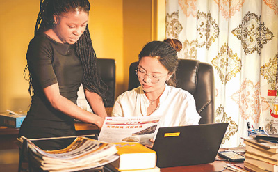 《非洲华侨周报》赞比亚分社编辑刘欢(右)和同事在值夜班。(南庚戌供图)