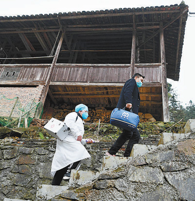 俞先超是贵州省黔东南苗族侗族自治州榕江县寨蒿镇便裳村村委会主任,妻子吴凤莲是村里的村医。2月11日,夫妻俩在疫情防控一线,入户排查、测量体温。王炳真摄(人民视觉)