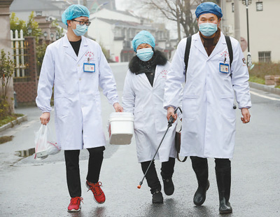 2月14日一早,浙江省德清县雷甸镇74岁的乡村医生鲁阿凤(中)和儿子鲁红伟(右)、孙子鲁舒阳背着出诊箱,开始了一天的疫情防控工作。谢尚国摄(影像中国)