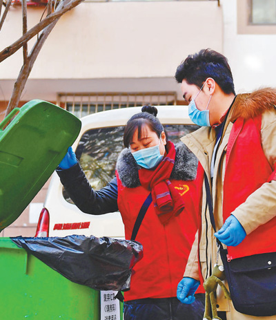 2月13日,青海省西宁市城西区兴海路街道办事处兴胜巷社区的工作人员张英霞与儿子吴建豪(右)检查兴胜巷社区消毒用品回收垃圾桶是否有混用现象。新华社记者