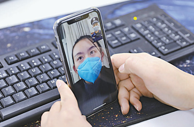 广西贺州市公安局平桂分局民警容梓茗(右)、贺州市八步区江南街道党政办副主任李秋珉夫妻二人收回发出去的婚礼请帖,在各自岗位抗击疫情。图为2月12日两人抽空视频相见,相互鼓劲。甘勇摄(人民视觉)