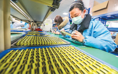 近来,江西省抚州市广昌县中广创新电子科技有限公司坚持疫情防控和复工复产两手抓,安全有序恢复生产。该企业生产的5G设备信号发射器件等产品应用广泛,畅销国内外市场。图为公司车间女工正在仔细检测电子元器件产品质量。曾恒贵摄(人民视觉)