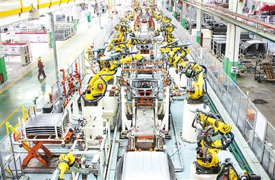在位于重庆的长安汽车渝北工厂总装车间内,生产线上的几百台机器人挥舞着手臂,将零部件逐一组建成型。这间“智慧工厂”自动化率达90%以上,比传统汽车制造工厂减少操作工人56%。同时,工厂内的工业物联网平台每天可采集制造数据5000万条,对设备运行情况实时监控并预警。